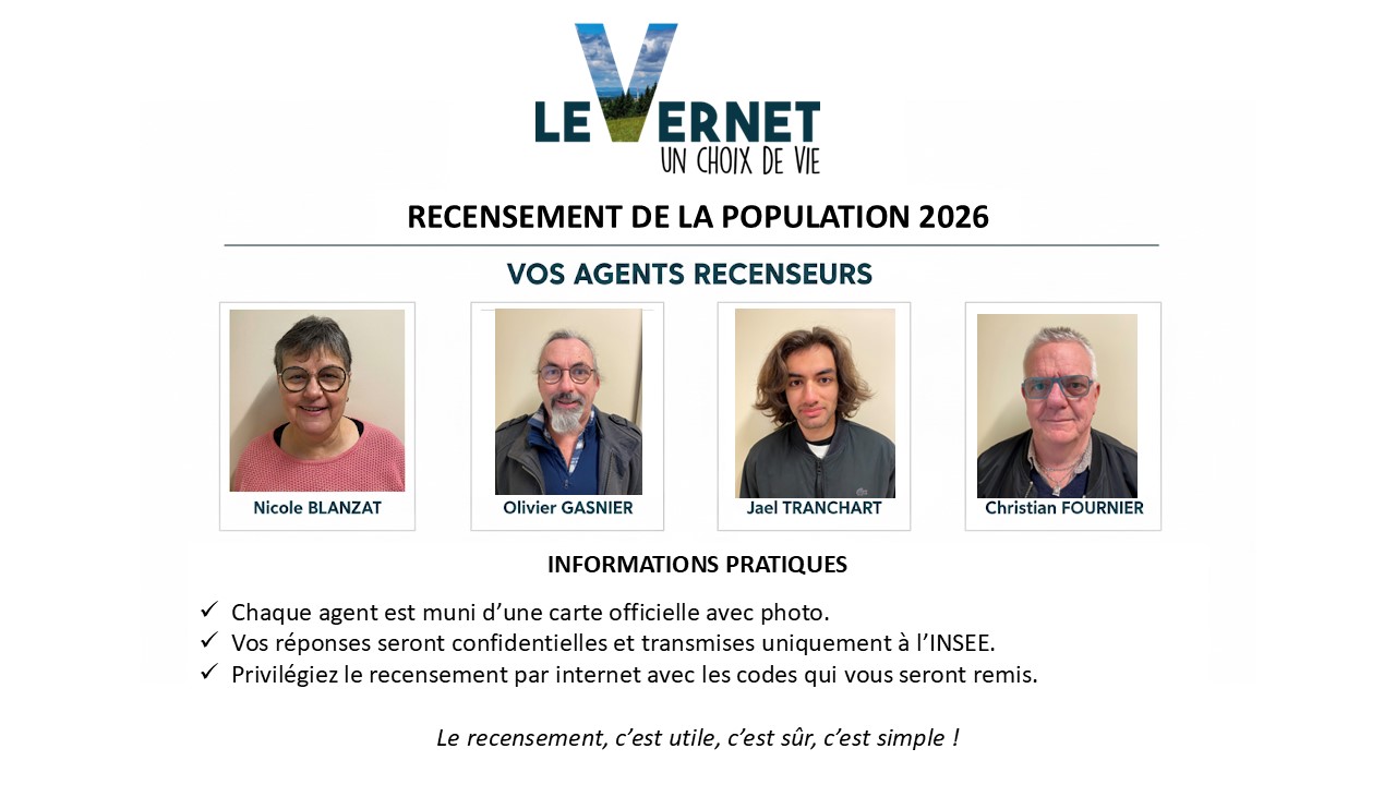 Le recensement se déroulera au Vernet du 15 janvier au 14 février 2026.
