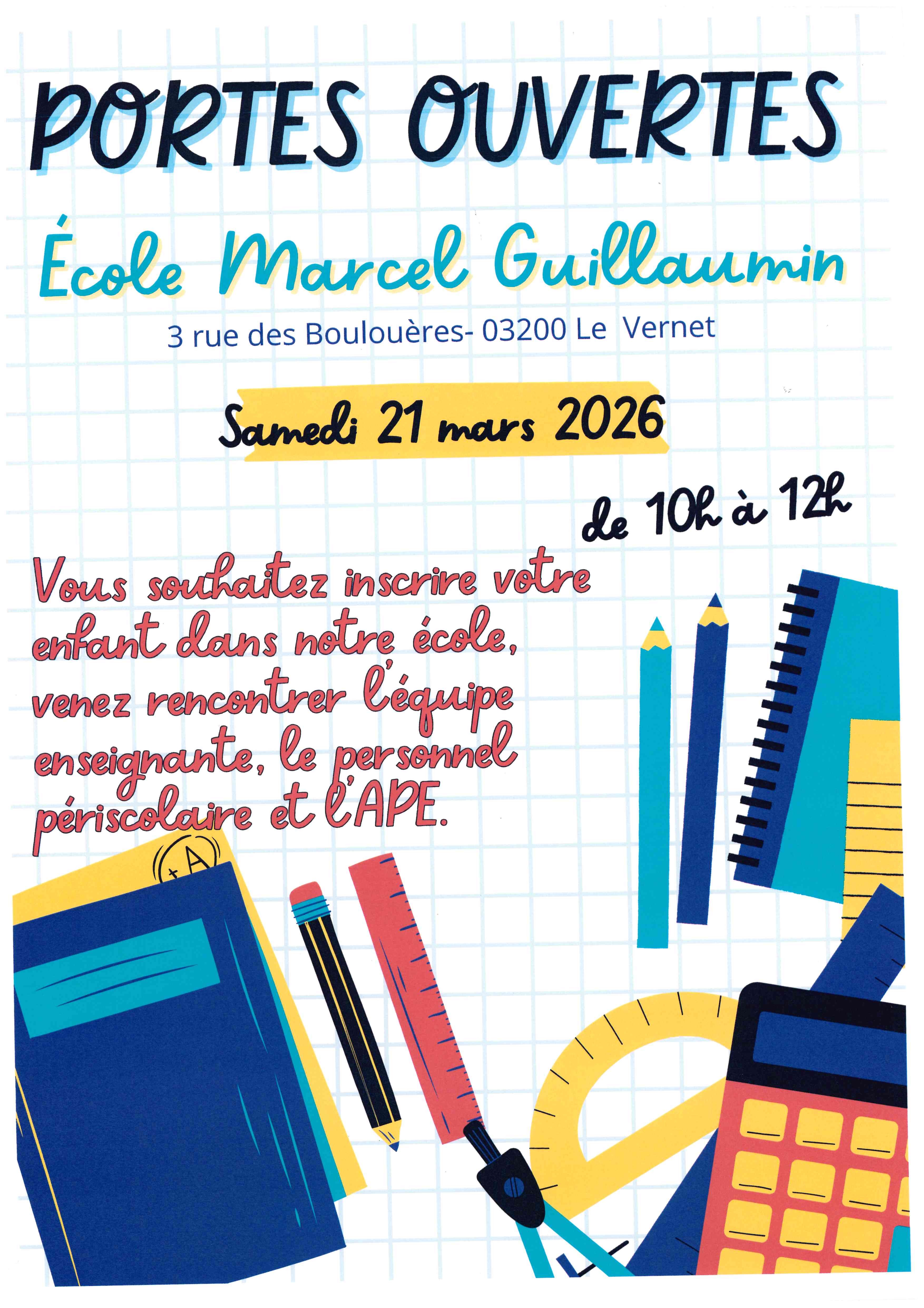 Une porte ouverte de l'école aura lieu le 21 mars 2026 de 10h à 12h.