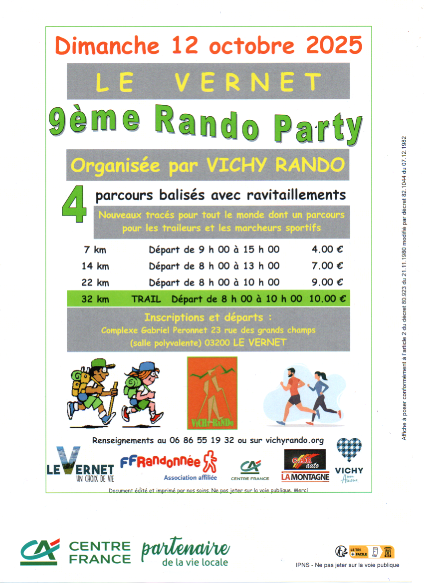 L'association VICHY RANDO organise la 9ème Rando Party le Dimanche 12 octobre 2025.