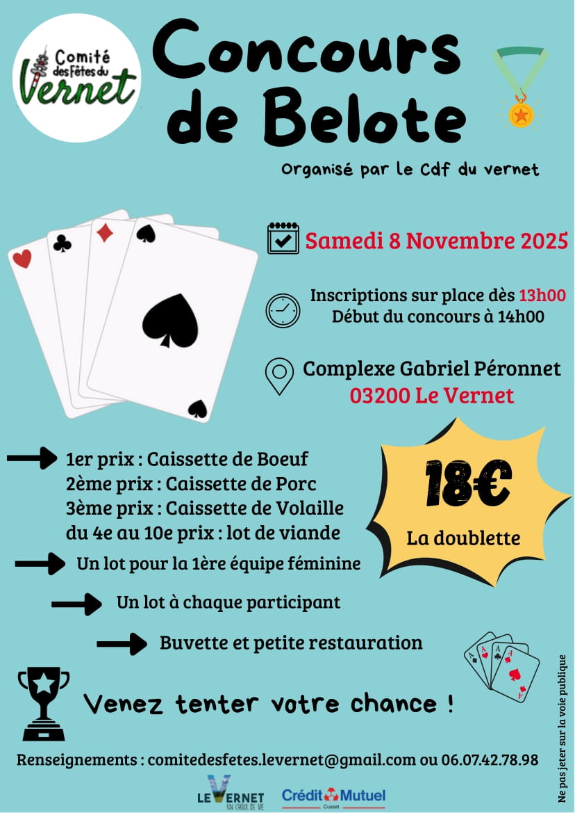 ♣ Concours de Belote organisé samedi 8 novembre 2025 par le Comité des Fêtes du Vernet