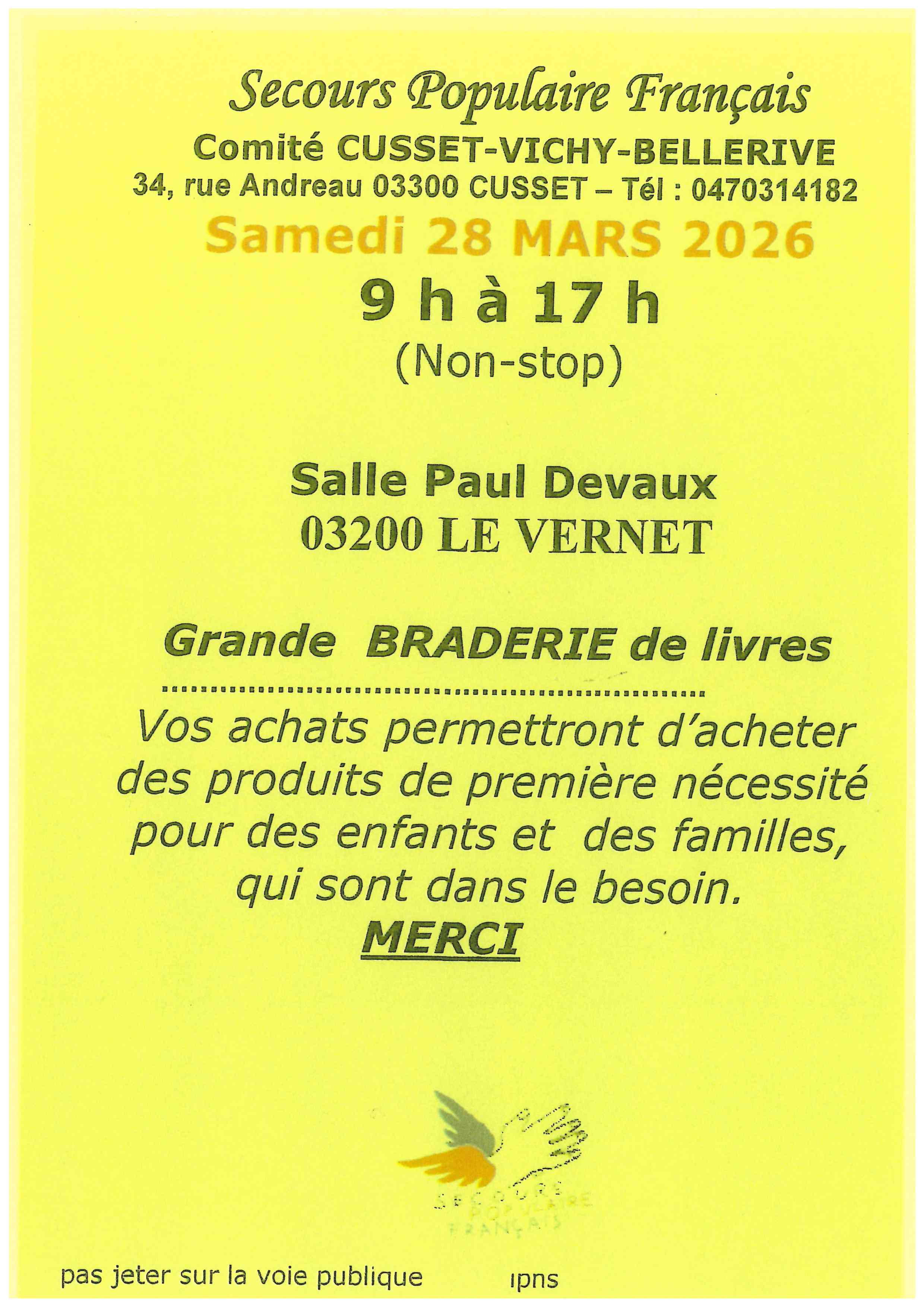 Le comité CUSSET-VICHY-BELLERIVE du Secours Populaire Français organise une grande braderie de livres :