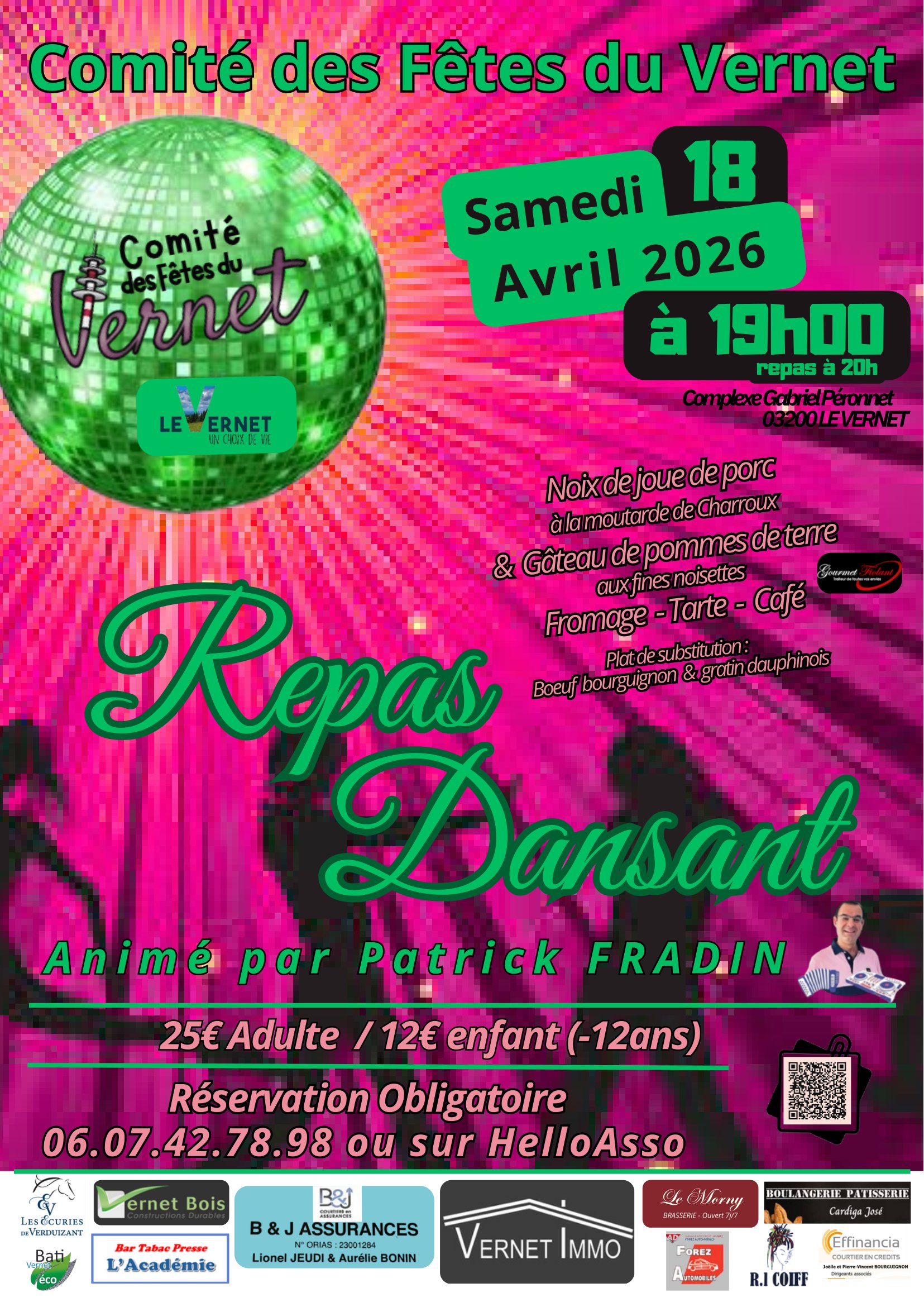 Le Comité des Fêtes du Vernet organise un repas dansant le samedi 18 avril 2026 à 19h au complexe Gabriel Péronnet.